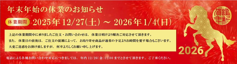 電話による各種お問い合わせ対応につきましては、年内12月26日(金)12:00までとさせていただきます。ご了承くださいませ。